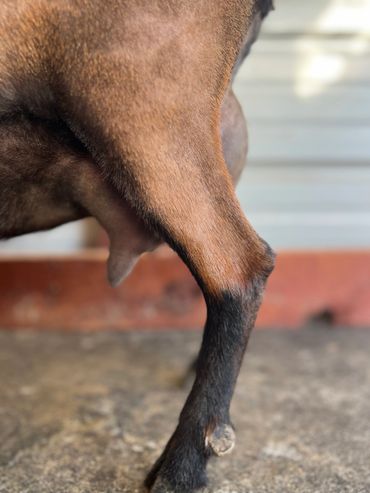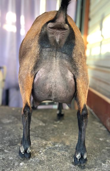 This pretty girl freshened for the first time in June 2024 and we are pleased with her udder shape and capacity. We think she will really bloom as a two-year old second freshener.