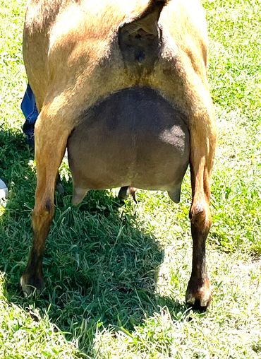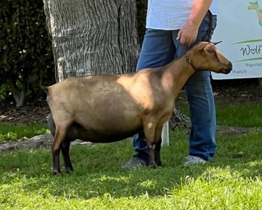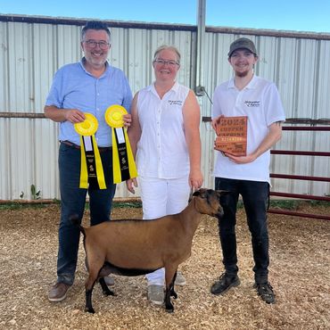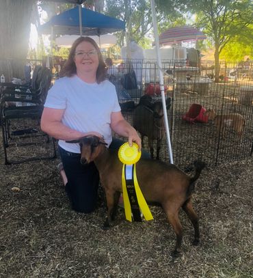 Chloe consistently places at the top of her class at shows and has been in the championship line-up 8 times this year (2024). The judge's comments about her are all the same - Chloe is a deep and powerful doe, but still very dairy. Our Southern California shows are incredibly competitive and I am honored that my first homebred doe is doing so well. She earned her first championship leg as a dry yearling in June 2021, and her second championship leg in 2024 as a four year old