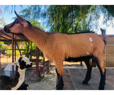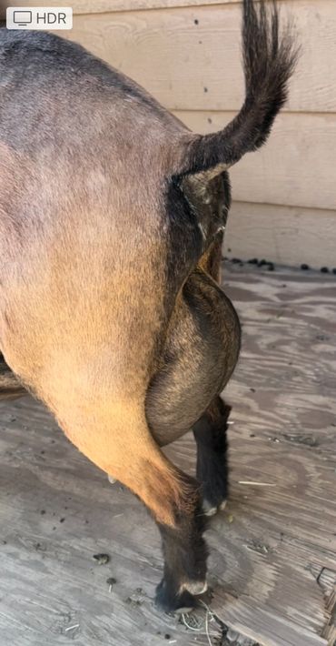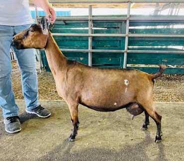 Cleo is a much more feminine doe than her littermate sister Chloe. She has not done as well in the show ring, but her udder is more capacious and she is an excellent milker and brood doe. At the conclusion of her Cleo's 2023-2024 lactation, she milked 1110 pounds of milk. She is on track to surpass that in her 2024 lactation.