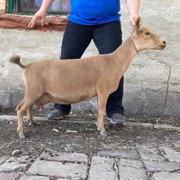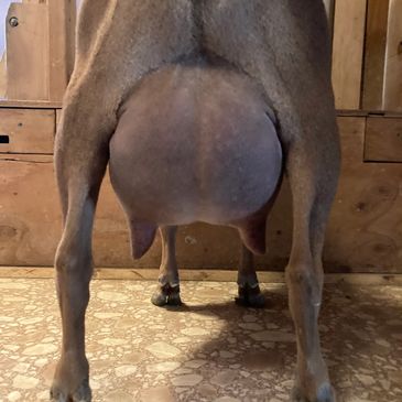 Her dam is a petite doe with a lovely topline. For a yearling milker, she has a beautiful udder with great teat placement. It is well attached and she has a very smooth foreudder.