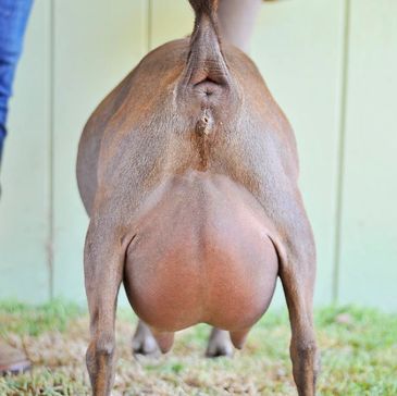Rain's Sire, Hidden Hills Chase the Legend is extremely correct and proportionate, balancing width and depth throughout. He possesses great dairy strength, refinement, flatness of bone, open ribbing and loose skin. Chase's Dam has produced two beautiful littermate sisters of Chase for Hidden Hills. Hidden Hills Natural Mystic earned an LA score of VEEE89 as a first freshening two-year-old. At 3 years old she stood 7th and the 2022 ADGA National Show and 2nd Place at the 2023 Nationals in her milking classes and then went on to earn the ADGA National Total Performer in 2023. Chase's second littermate sister, Hidden Hills Fancy That earned an impressive LA score of VEEE91 at 4-years-old in 2023.